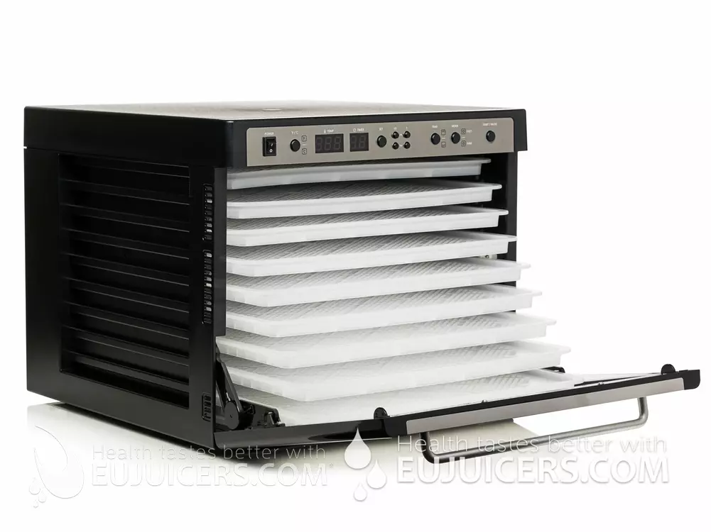 - pojemnością – duże rozmiary i aż 9 tac, czynią ją idealnym wyborem dla zwolenników surowego odżywiania i osób zdrowo odżywiających się;