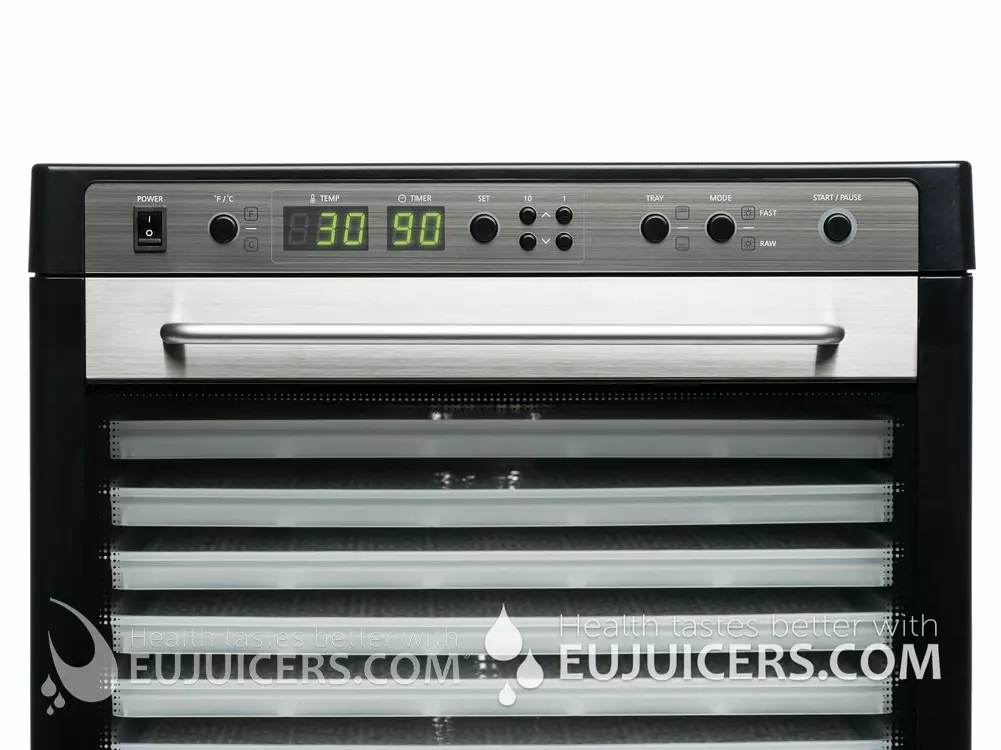Sedona posiada minutnik, przy pomocy którego można wyznaczyć czas suszenia nawet do 99 godzin bez przerwy! Termostat suszarki Sedona kontroluje, aby temperatura w komorze suszenia oscylowała wokół wartości wyznaczonej przez użytkownika. Możesz ustawić temperaturę od 30 – 68st.C. Cyfrowy panel sterowania pozwala wygodnie modyfikować ustawienia, wyświetla czas i temperaturę suszenia. Diody informują, który tryb został ustawiony.